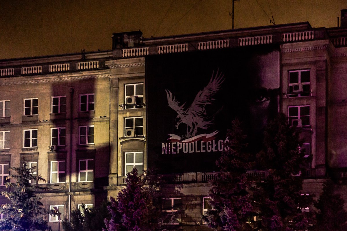 A symbol of Polish bravery displayed on a government building, today in Warsaw. Next to it, a poster with a past leader.
