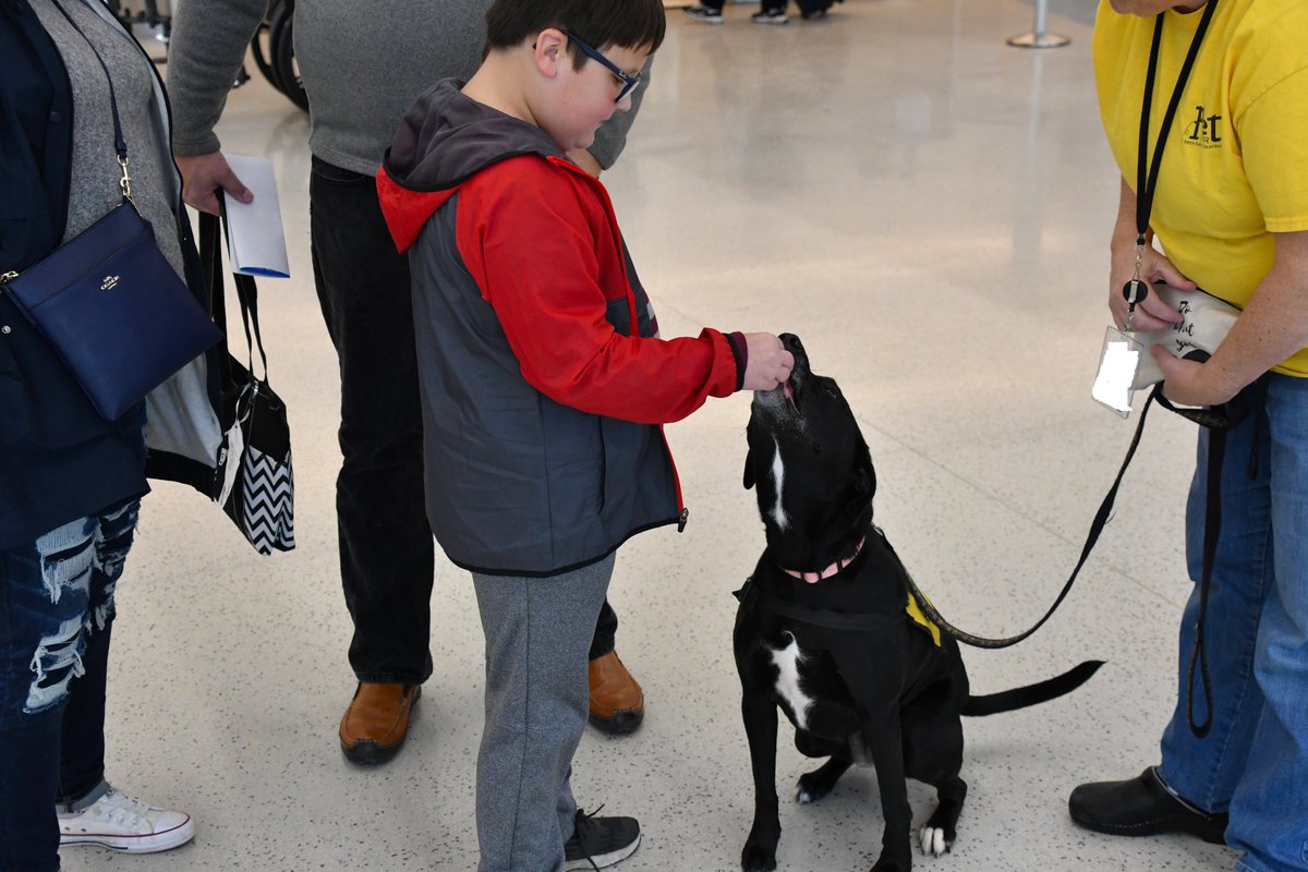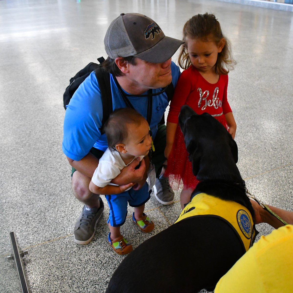 #SYR Airport later today? Keep an eye out for@pawsofcny PET Program team Poppy & her human Martina! Our#therapydog teams are easy to spot: just look for yellow-vested#dogs, yellow-shirted humans, & "PET ME" leash wraps next time you fly out of SYR!