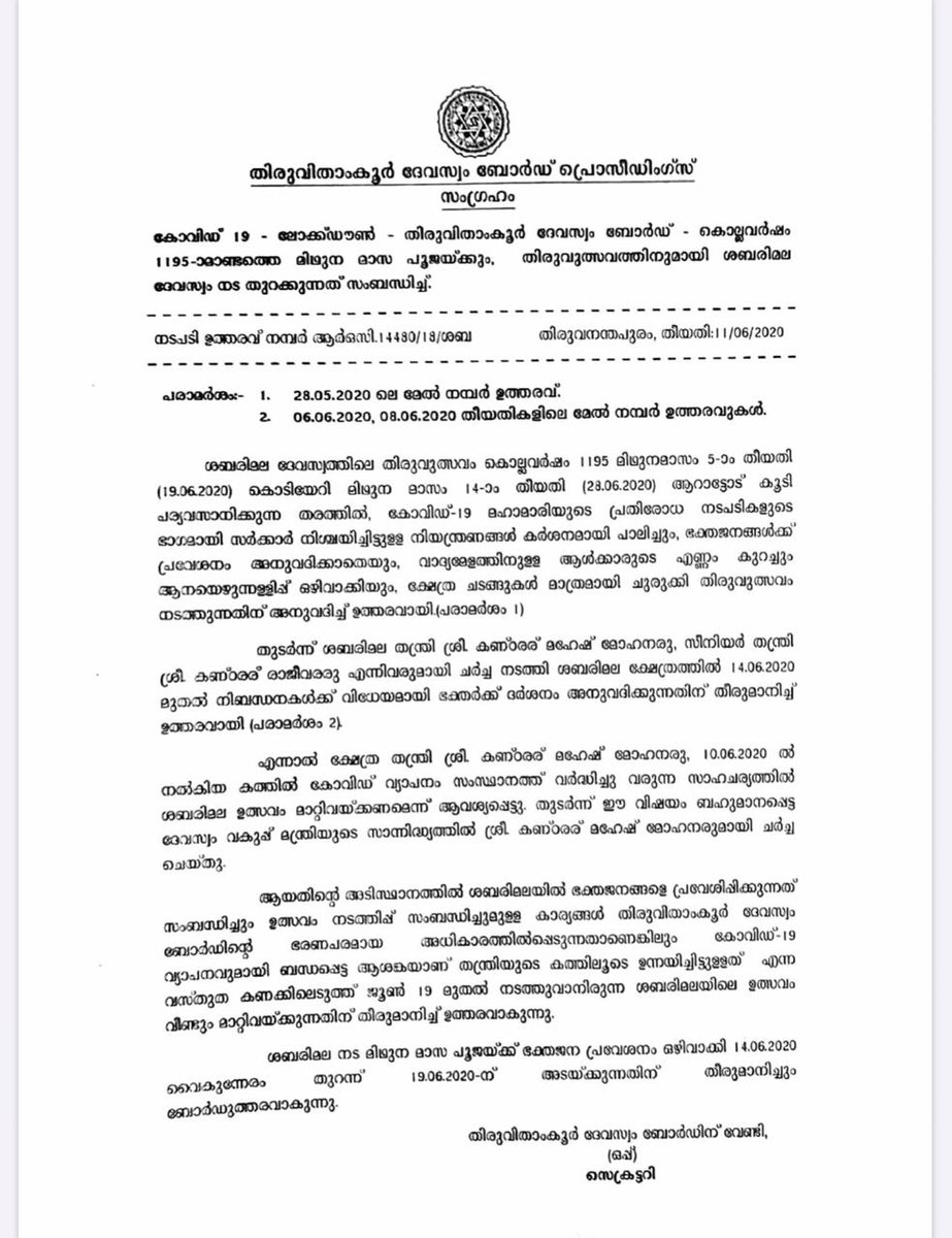 #SabarimalaTemple festival, which was scheduled to begin from 19 June, due to#COVID19. Temple will open for rituals from 14-19 June without Devotees.pic.twitter.com/L0FNPO7oE8
