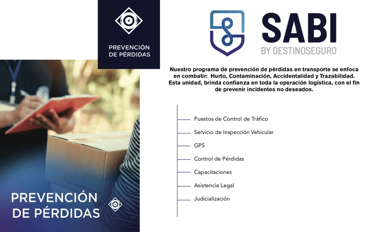 #SABI Nuestro programa de prevención de pérdidas en transporte se enfoca en combatir: Hurto, Contaminación, Accidentalidad y Trazabilidad. Esta unidad, brinda confianza en toda la operación logística, con el fin de prevenir incidentes no deseados. pic.twitter.com/g9YDJro5qA