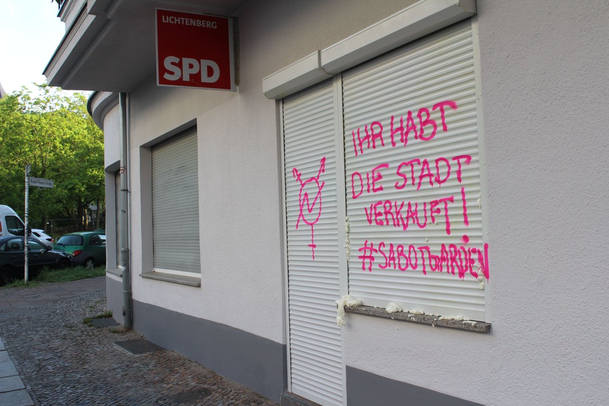 #SabotGarden unterwegs und haben die SPD & Investor*innen besucht. Laut den Cops gab es auch in der Köpenicker Glasbruch. Heraus zum revolutionären 1. Mai! http://de.indymedia.org/node/80040 pic.twitter.com/4ihig4uek6