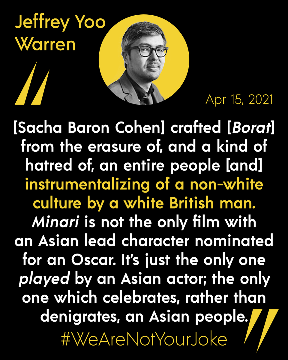 @jywarren discussed how#Borat is a word forged in erasure, humiliation, and hate of#Kazakh people. Read his essay: https://unterbahn.medium.com/alchemy-the-n-word-borat-and-anti-asian-hate-d4eae08c2d04 …#WeAreNotYourJoke#NoAwardForBorat#CancelBorat#StopHateForProfit#StandAgainstHatred#StopAsianHate