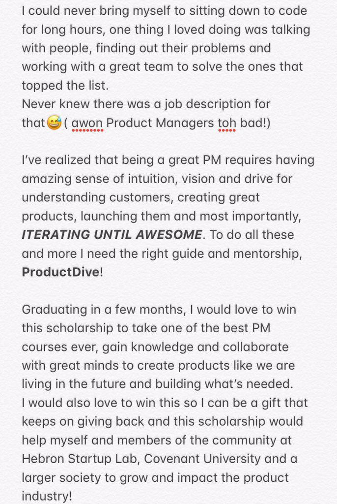 . This is a chance to improve at one thing I know I can really be great at and make impact in, Product Management. Please help me win this @DadaBen_@ProductDive scholarship and make my year