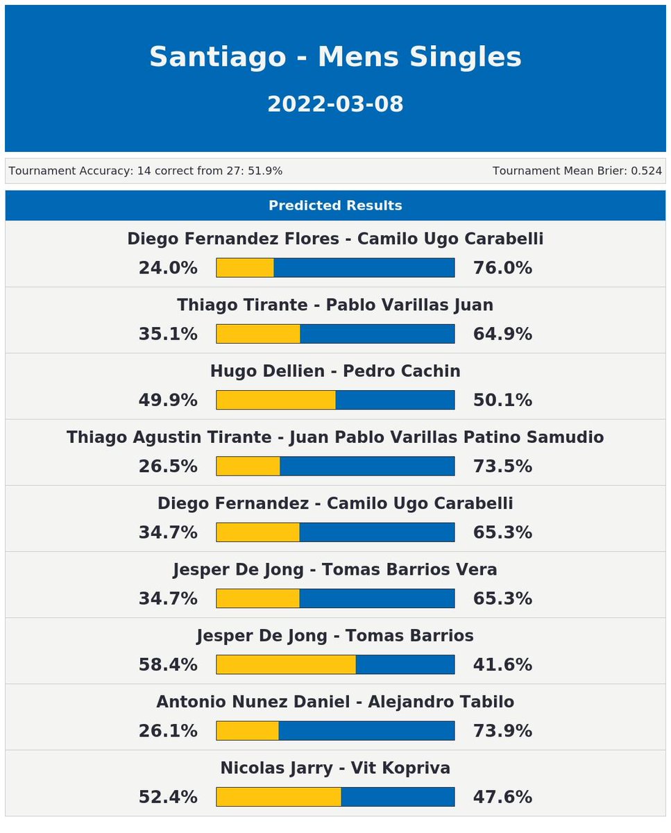 Our predictions for all games happening today (timezone=UTC) in Santiago - Mens Singles.