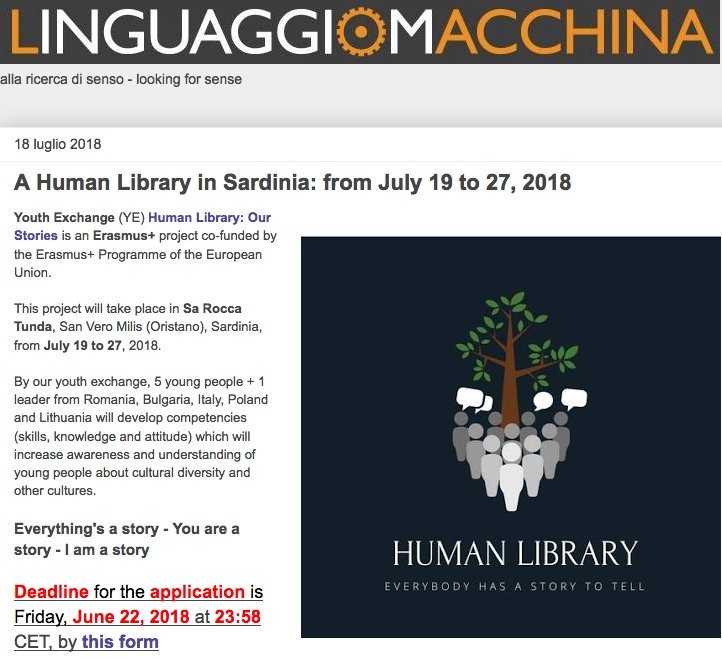 #Sardinia: from July 19 to 27, 2018 https://linguaggio-macchina.blogspot.com/2018/07/a-human-library-in-sardinia-from-july.html …#Erasmus#Sardinia#HumanLibrary deadline: June 22, 2018pic.twitter.com/ZdwD0icTgH