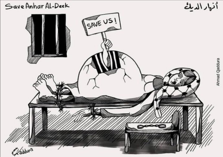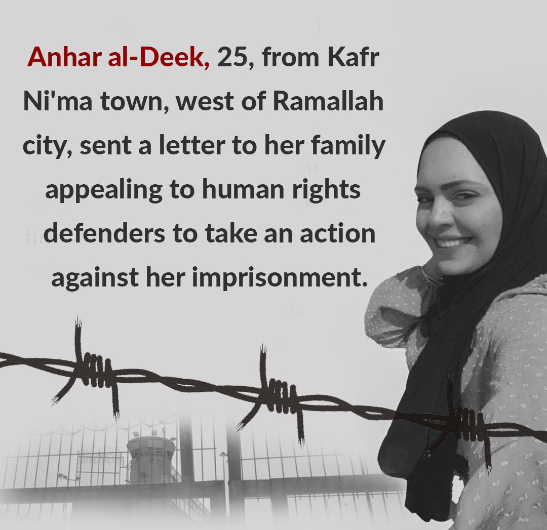 Anhar Al-Deek (25), was detained when she was four months pregnant. Last week, she appealed to the international community to pressure Israel to release her and allow her to give birth outside prison.