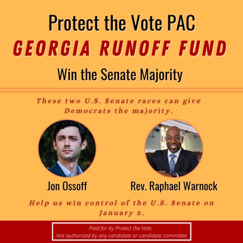 #FlipGABlue! ELECT#JonOSSOFF! ELECT#RaphaelWARNOCK!#SaveOurCourts!#SaveThePostOffice! PLEASE GIVE TODAY! https://secure.actblue.com/donate/bah-email-20201129?refcode=em20201129-1103&t=2&refcode2=1103_287086_P0xvgP&akid=1103%2E287086%2EP0xvgP … -