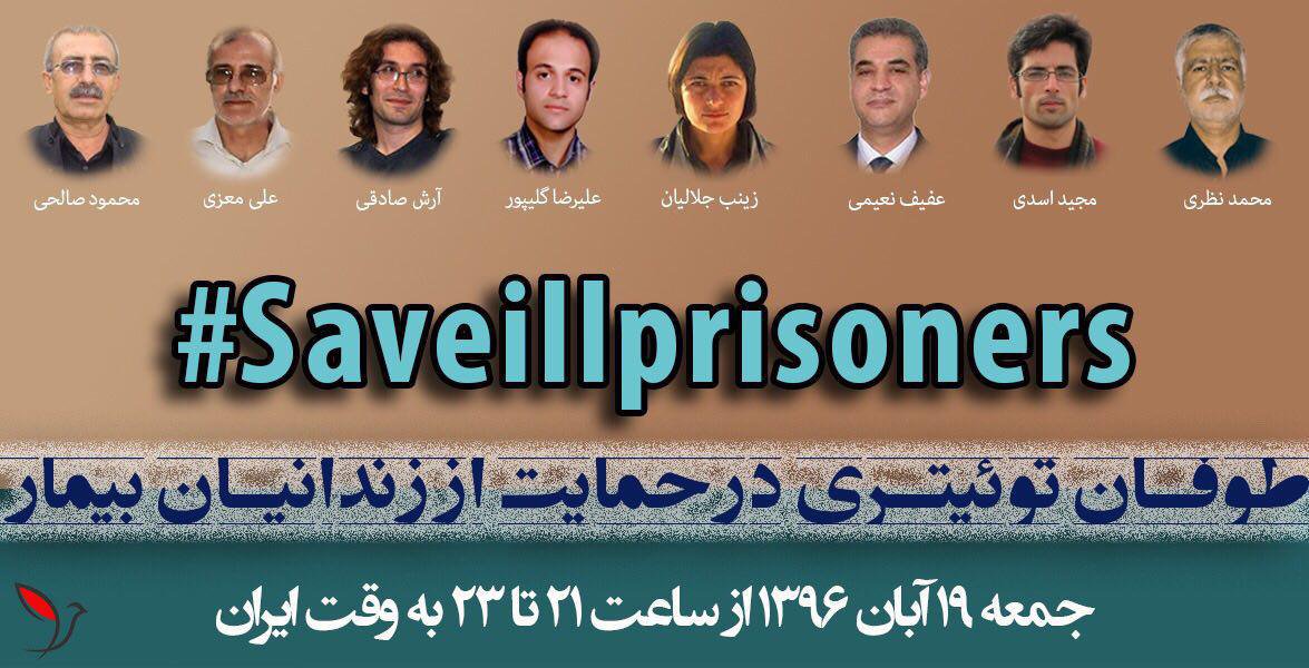 #زندانی_بیمار زندان نیست، بیمارستان و خانه است. زندانیِ بیمار، یعنی#مرگ_تدریجی، یعنی#محمدجراحی، کلیههای#محمودصالحی، چشمهای#زینب_جلالیان، سرطان علی_معزی و#علیرضا_گلیپور. یعنی#محمدنظری،#مجیداسدی.#Saveillprisoners -
