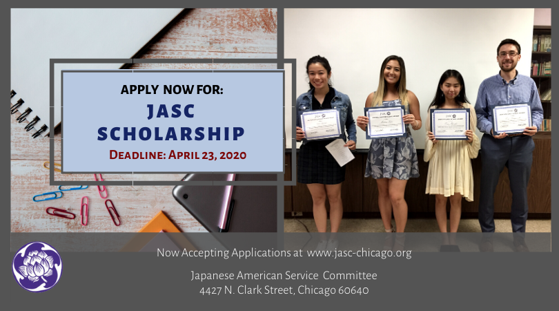 Deadline- 5:00 PM, on Thursday, April 23, 2020 submit your completed application materials and transcript to the Japanese American Service Committee, Scholarship Committee, 4427 North Clark Street, Chicago, Illinois 60640.