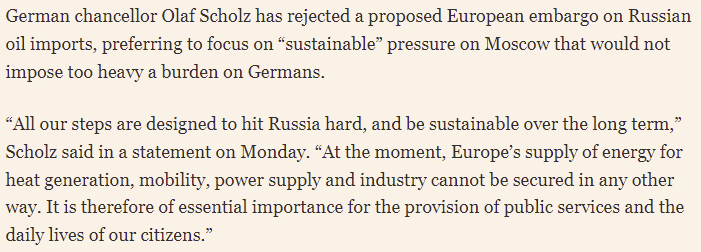 #Scholz is blocking an oil embargo on#Russia. I am a little speechless. And very much understand why our Eastern European neighbors are - since many years - very frustrated with German governments Story via@FT https://www.ft.com/content/94b12297-b7c7-4923-9d95-86f196e90503 …pic.twitter.com/EVr2O4EIPl