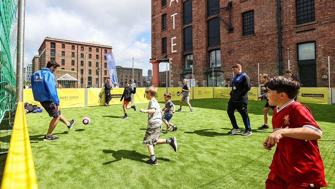 Try out your football skills with our professional coaches from Everton In the Community and LFC Foundation. FREE sessions will take place daily on our football pitch in the centre of a custom built pontoon in the centre of