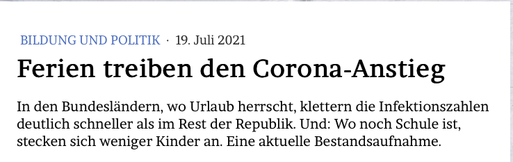#SCHULFERIEN TREIBEN DEN#CORONA-ANSTIEG In den Bundesländern, wo Urlaub herrscht, klettern die Infektionszahlen deutlich schneller. Und: Wo noch#Schule ist, stecken sich derzeit weniger#Kinder an. Im Blog: https://www.jmwiarda.de/2021/07/19/ferien-treiben-den-corona-anstieg/ …pic.twitter.com/GZjVVjsUl0