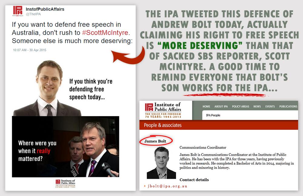 I wonder what role Andrew Bolt's son (& IPA employee) had in this tweet comparing him with