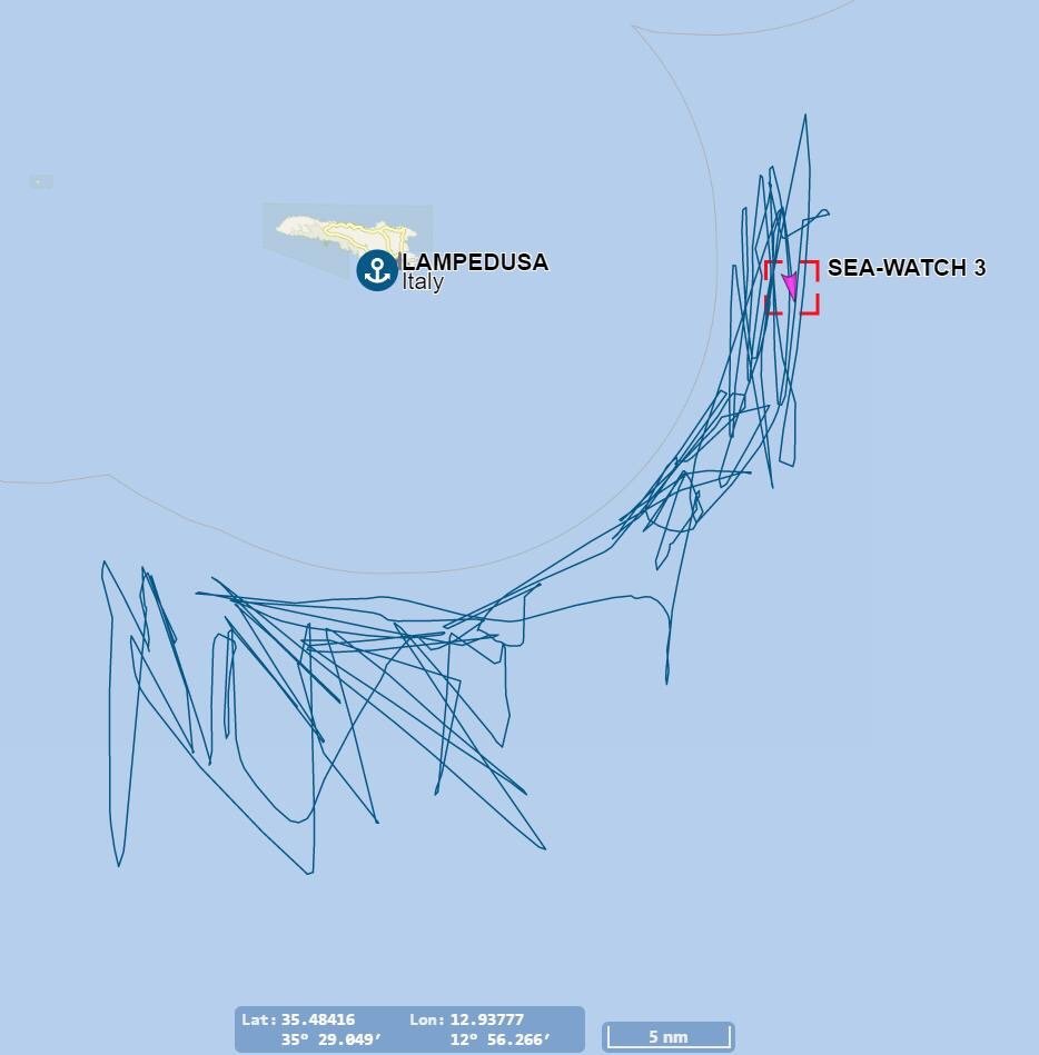 #SeaWatch 3 the last days. It draws the border between Italian territorial water and international water. Can you see it? 42 people are forcibly kept outside. 42 people that Europe, a continent of over 500 million inhabitants, does not want. Forty-two. pic.twitter.com/0iNndCKQiu