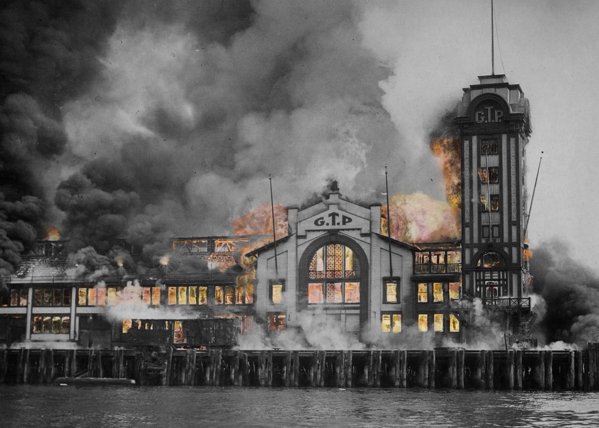 On July 30th, 1914, the Grand Trunk Pacific dock located on the Seattle Waterfront was destroyed by fire. At the time it was the largest wooden pier on the West Coast. One Seattle Firefighter and four civilians died.