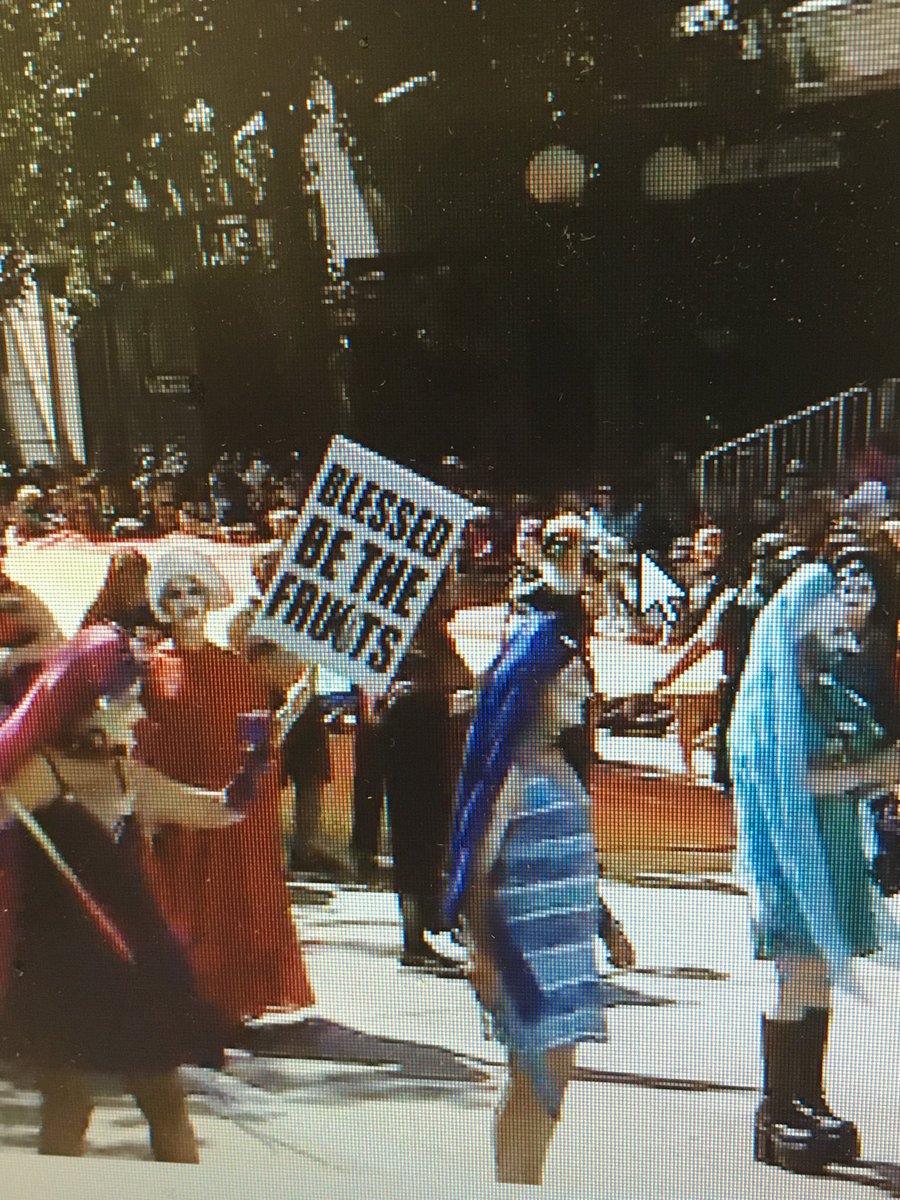 #SeattlePride parade dressed as a handmaid from The Handmaid's Tale. The sign: "Blessed Be The Fruits" pic.twitter.com/Ob5DXtrVsa