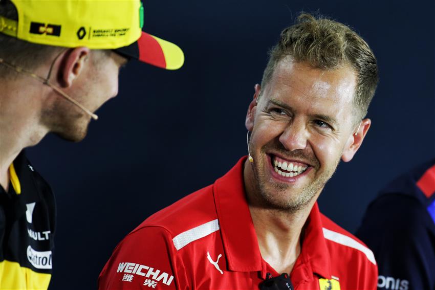 Sebastian Vettel smiles as he chats with Nico Hulkenberg during the press conference today in Hockenheim.