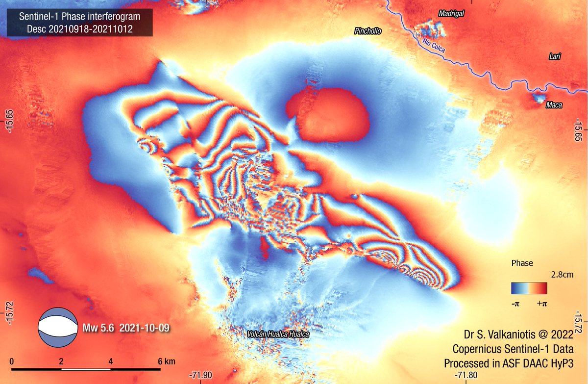 #earthquake occured two days ago ( March 16 2022) in the Rio Colca valley area, Arequipa, Peru (https://www.igp.gob.pe/servicios/centro-sismologico-nacional/evento/2022-0160 …). A similar event on October 9 2021 (M5.6) gave widespread & complex surface deformation, as seen in this#Sentinel1 coseismic interferogram. pic.twitter.com/6lqYKhqEdT