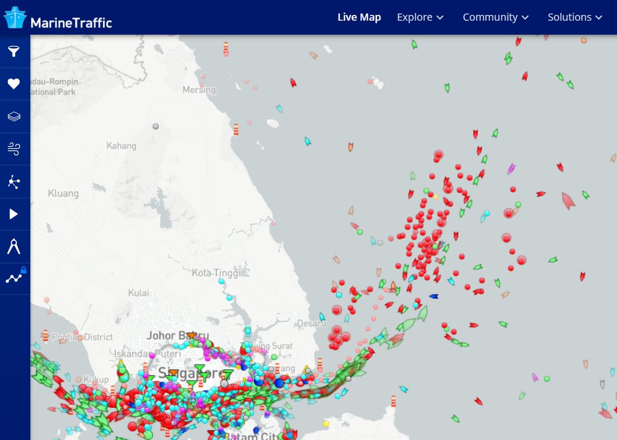 AIS by @MarineTraffic Many ships have AIS on, but many do not. Some ships think "Outside of Port Limits" or "OPL" as free parking, but it is not. It is inside Malaysian EEZ. Anchoring requires a permit.pic.twitter.com/LJnFPa7WkL