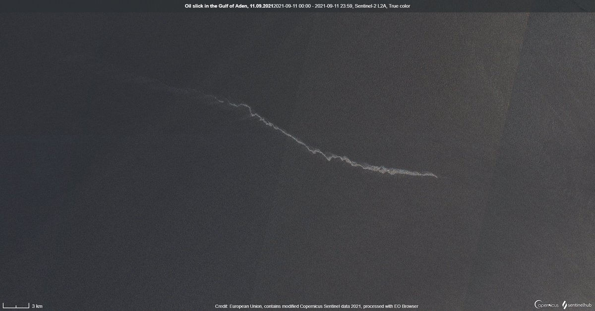 Something leaking a 45 km slick in the Gulf of Aden, halfway between Yemen and Somalia. 12°36'04.7"N 48°39'23.0"E Copernicus