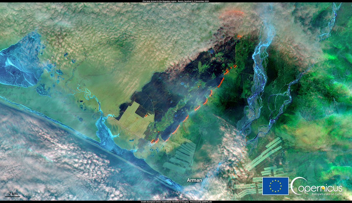 Deze nieuwe branden zijn lastig te temmen, want de temperaturen dalen tot -20°C en het bluswater bevriest in de tanks. #Copernicus#Sentinel2