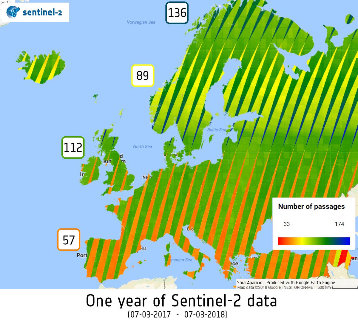 #Sentinel2B was launched one year ago, joining its twin#Sentinel2A. Here is a overview of#Europe coverage by the#Sentinel2 Mission. Number of passages by#S2A and#S2B over the last 365 days.