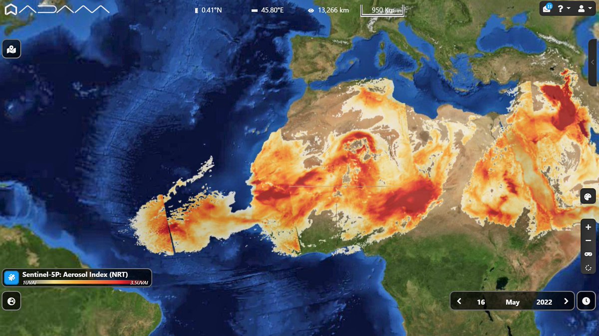 #dust plumes captured today May 16th by the#Copernicus#Sentinel5p Aerosol Index. As forecasted by@CopernicusECMWF CAMS a#Saharandust cloud is flying over W.#Africa heading to#Caribbean, while a big#DustStorm is visible over#Iraq and#SaudiArabia.#AirQuality@WMOpic.twitter.com/eS1MjnjZBf