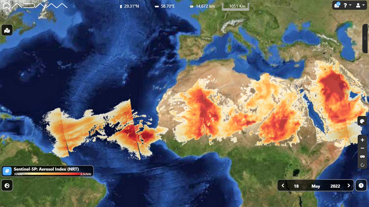 #Dust! The#Copernicus#Sentinel5p Aereosol Index captured multiple clouds on May 18: the massive#DustStorm over Middle East and the#Saharandust plume flying over Atlantic heading to#Caribbean, as forecasted by@CopernicusECMWF CAMS.#AirQualitypic.twitter.com/vYOcQlWpYH