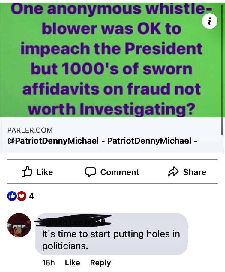 @Facebook, threatening to put holes in politicians doesn’t go against community standards? You know that politicians have been targeted before and people have acted out these threats. Example :@GabbyGiffords Disgusting that you would allow this to stay#facebook#shameful pic.twitter.com/fUk2wISk9h