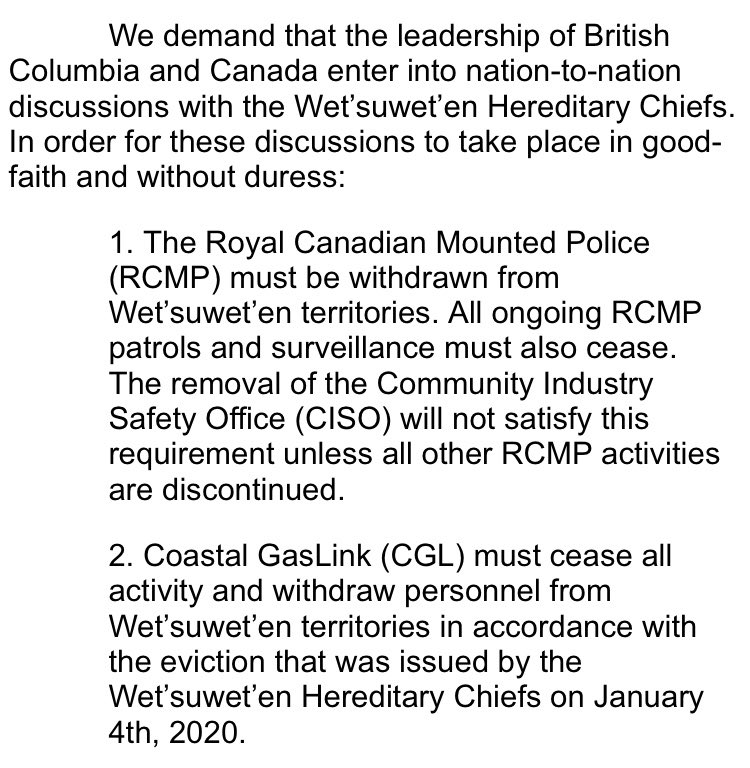#IndigenousYouthforWetsuweten#ShutDownCanada Below are our national demands—please share widely & send messages to the elected officials named telling them to meet w/the Indigenous youth who have spent 16 days on their doorstep!#WetsuwetenSolidaritypic.twitter.com/uT4xFpoON1