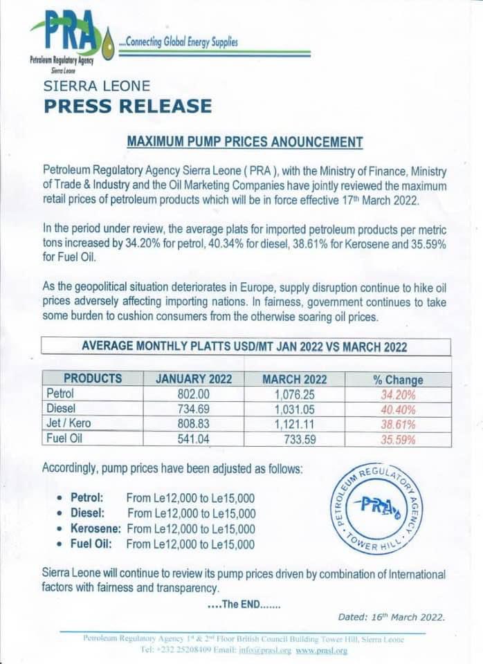 Sierra Leone’s petroleum regulator has increased fuel prices by 50% in two weeks. 1 liter is now 15,000 ($1.28) 1 gallon is now 56,700 ($4.8)