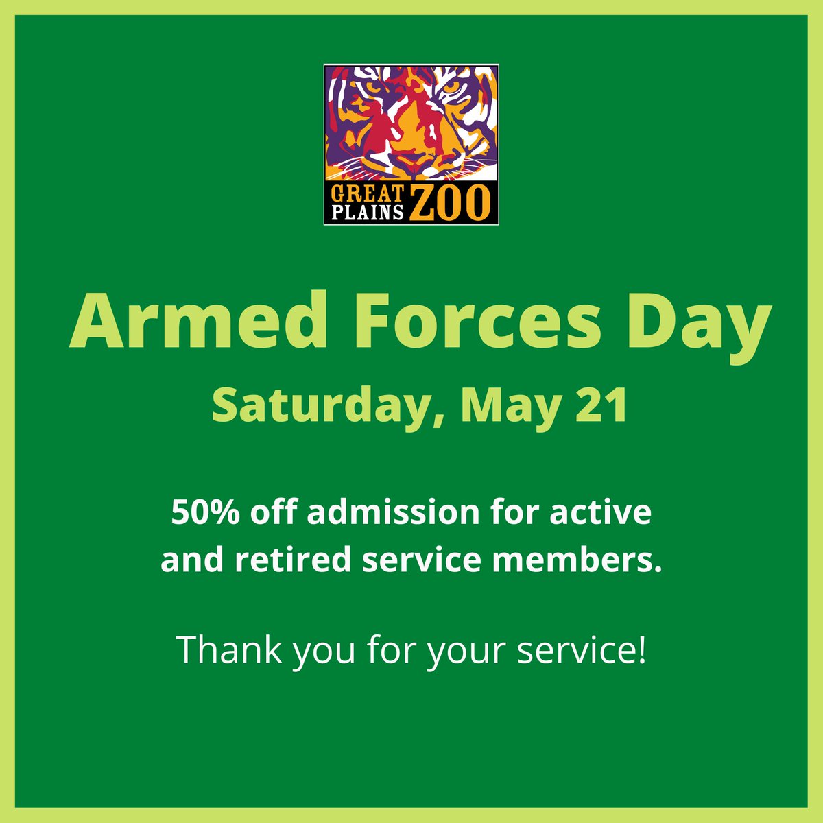 We are grateful for our U.S. service members! It's our pleasure to offer active and retired members of the armed forces 50% off regular zoo admission on Armed Forces Day - Saturday, May 21. Thank you for your service!
