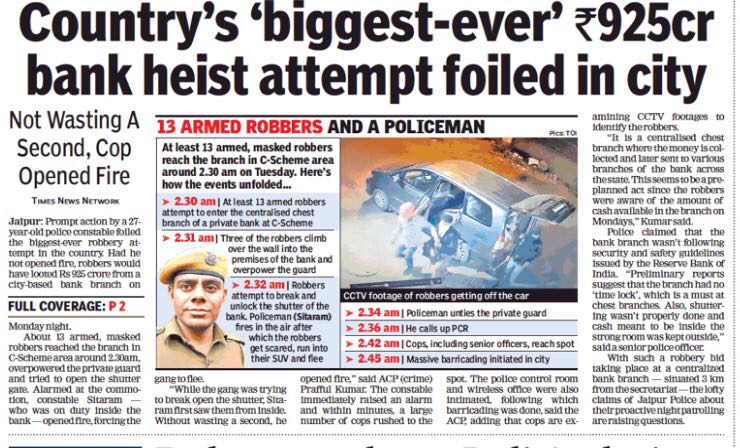 #ProudMoment~ In an exemplary display of valour, our young constable#Sitaram showed unprecedented bravery & saved the huge amount of 925 Crore in a#BankRobbery.#RajasthanPolice is proud to have cops like you.@HMOIndia@PMOIndia@VasundharaBJP@IPS_Association@jaipur_policepic.twitter.com/H4LvynNrKy