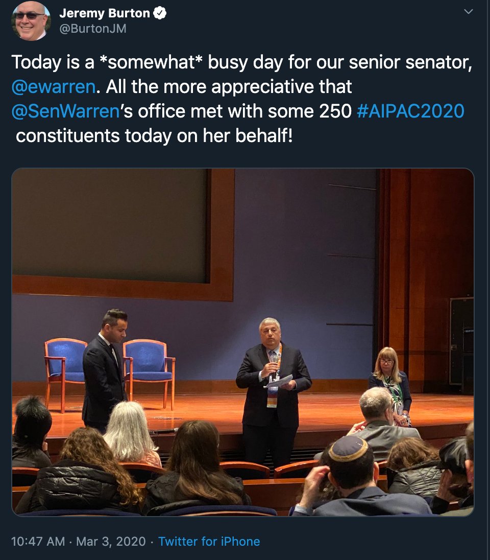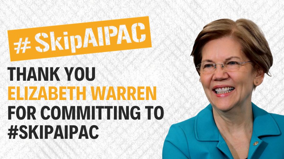 @ewarren supporter! Acting on our shared progressive values of justice, equality, and democracy (in Israel and Palestine and the US), she didn't miss a beat when asked to#SkipAIPAC this year. https://twitter.com/IfNotNowOrg/status/1230889424445169665 …