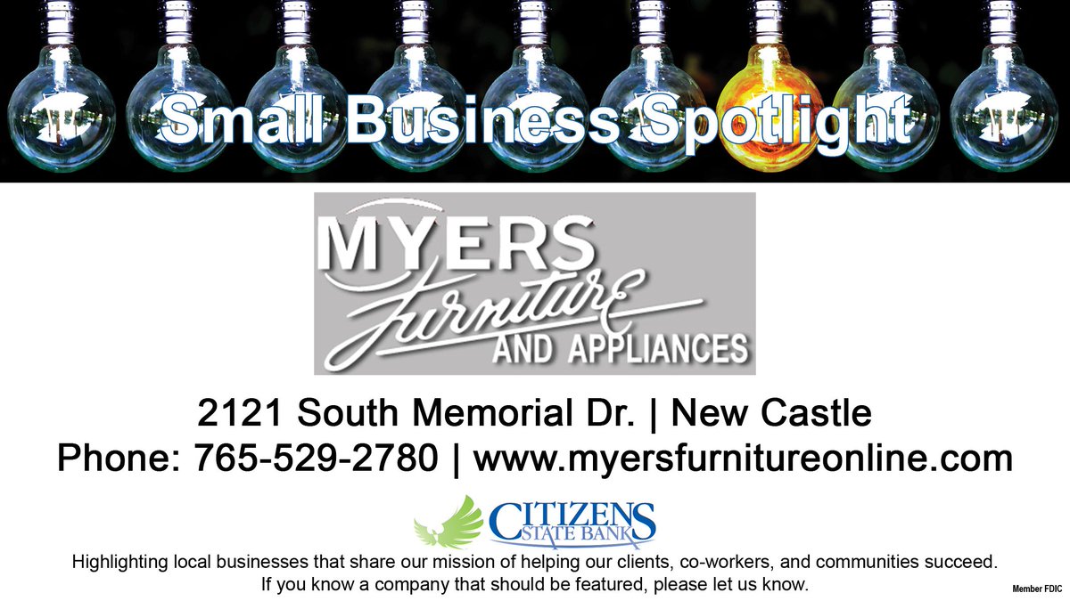 #SmallBusinessSpotlight, we're featuring Myers Furniture. They've been in business for 76 years, provide many area jobs, and volunteer in our community. Stop by our New Castle-Trojan Plaza office (by Kroger) to learn more. pic.twitter.com/gYylAxoZcN