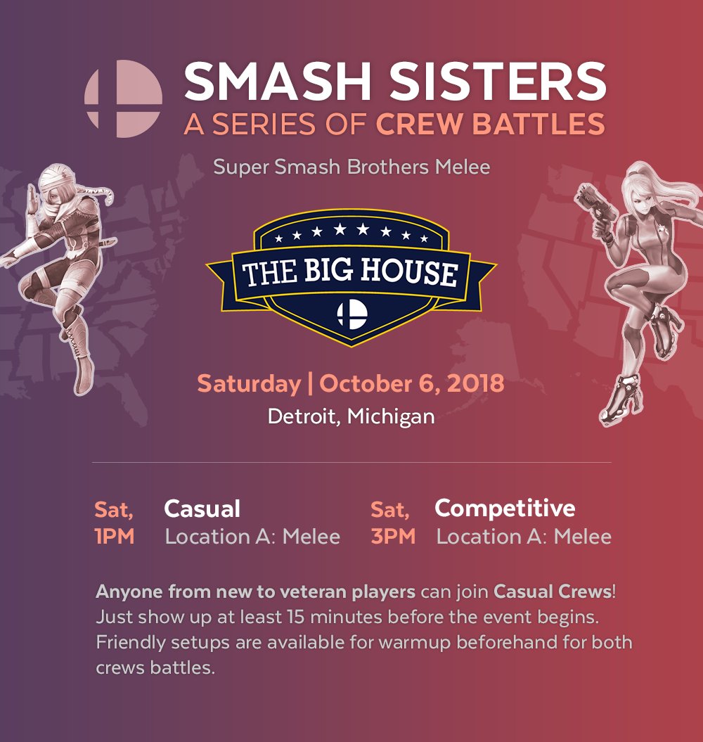 #SmashSisters will indeed be at#TheBigHouse8 this weekend! Come play or cheer for your friends! Schedule and information below. Our organizers are also tagged in the photo for any questions you might have!#TBH8pic.twitter.com/XUqVqTA9OV