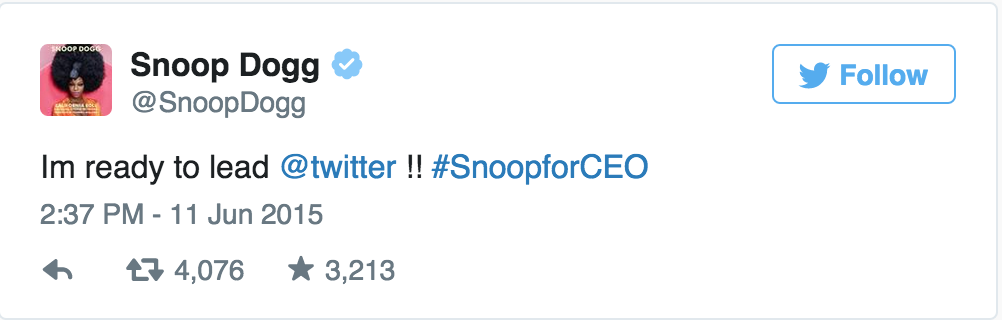 @SnoopDogg for Twitter CEO: http://usat.ly/1Tgs6me#SnoopforCEO