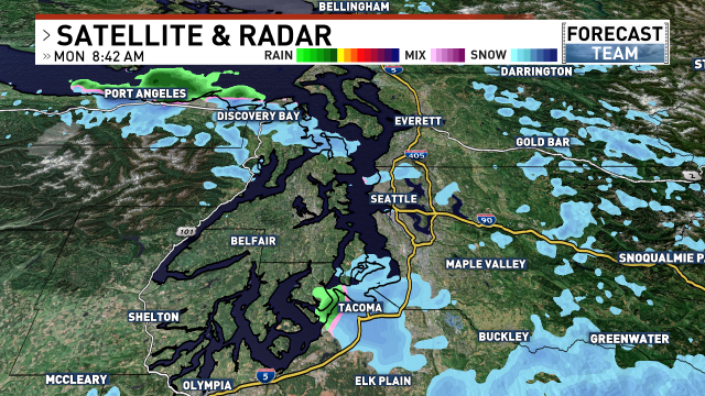 Wet snow falling in areas of Tacoma, Sequim, and Port Angeles. Light rain & snow mix in Shoreline.