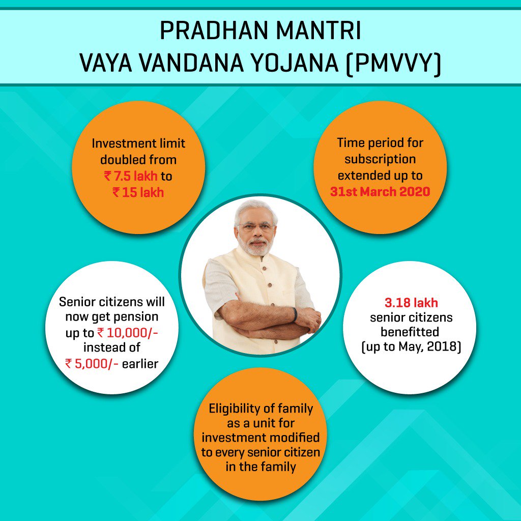 @NarendraModi launched Pradhan Mantri Vaya Vandana Yojana in 2017 to provide adequate social security to people in their old age. The time period for subscription for the scheme is extended up to 31st March 2020 so that more people can reap its benefits.#SocialSecurityInIndia pic.twitter.com/IIePQRlC6U