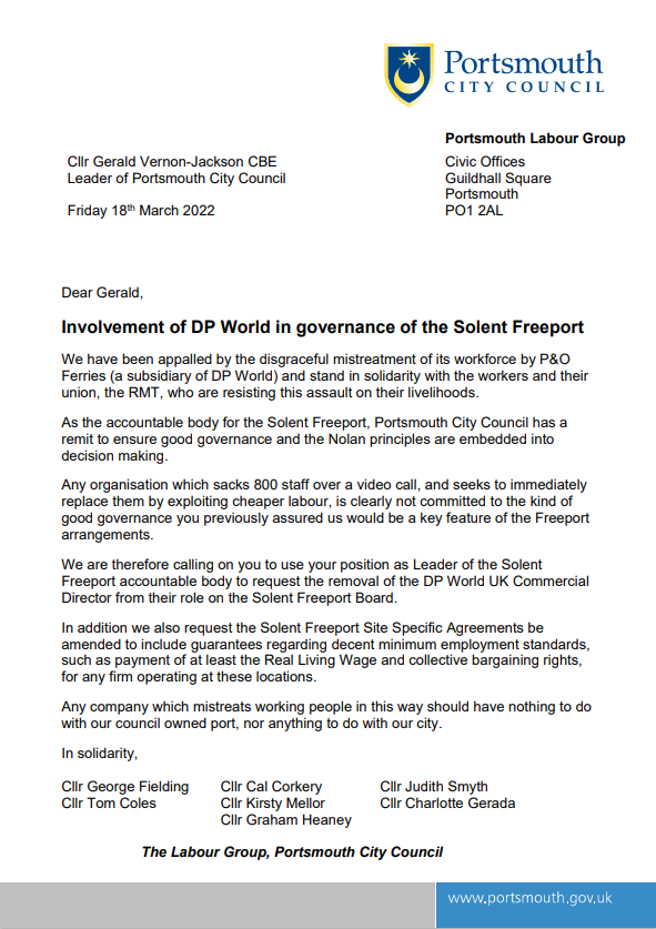 In response to the disgraceful mistreatment of workers by P&O the Labour Group on Portsmouth City Council is calling for the removal of the DP World rep on the Solent Freeport Board and guarantees of decent employment standards at Freeport sites