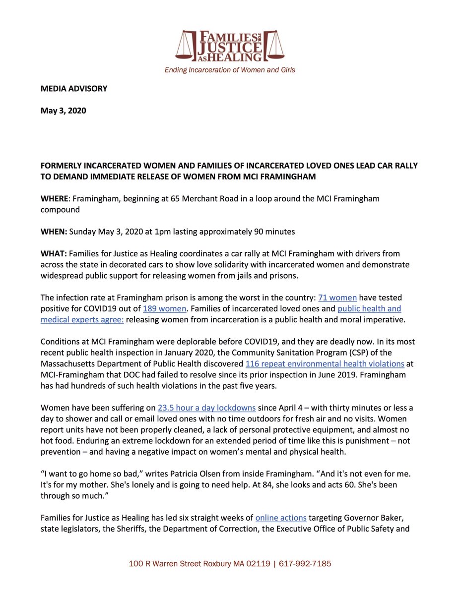 #SolidaritySunday car rally at Framingham on 5/3 - our 3rd protest + biggest yet! We are fighting to release women right now, house everyone, resource Black and Brown communities, & reimagine MA without prisons.#FreeHerpic.twitter.com/unF2pqjNJP