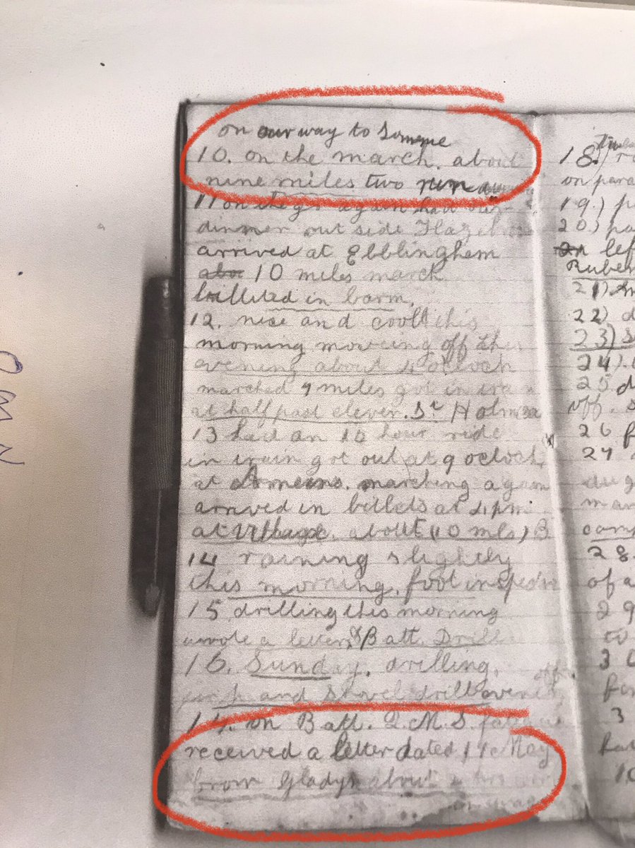 #ww1#AIF grandads diary - he’d already been gassed x1 recuperated in England, met wife to be & heading to#Somme aged 20. Diary damaged so don’t know what letter was about#ebblinghem#anzacpic.twitter.com/N6aT7zUnD0