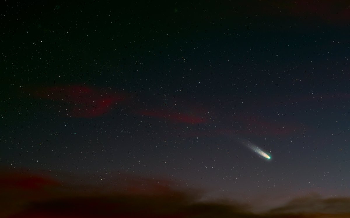 In case you were curious how much Leonard moved during the 12 minutes I shot it the other night. This is reversed, the comet is actually moving into the tail. The orange streaks are clouds.