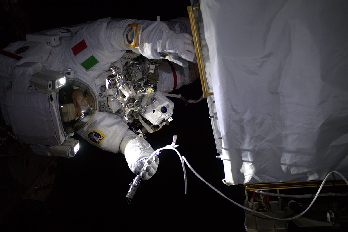 AMS2: Alexander, from the SO1 module, photographed my exit from the Airlock. AMS2: Alexander, dal modulo russo SO1, mi ritrae durante l’uscita dall’Airlock.