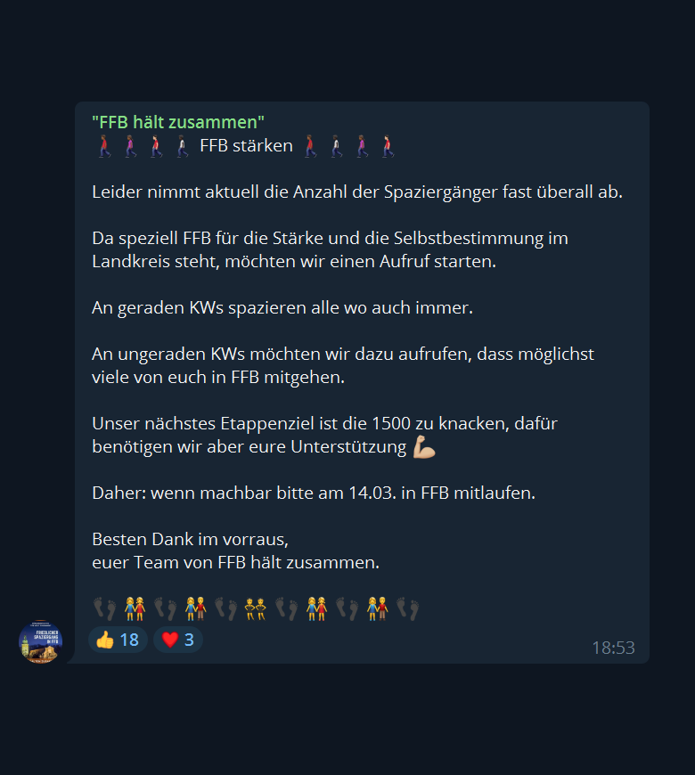 #Spaziergänge/r nimmt fast überall ab. Daher macht sich die#Fürstenfeldbruck/er Orga um#MerlinEilers Gedanken darüber, wie man zukünftig noch "Masse" zeigen kann. Die Idee, an ungeraden Kalenderwochen alle nach#FFB, sonst läuft jeder wo er will.pic.twitter.com/Q7MkYrNVoq