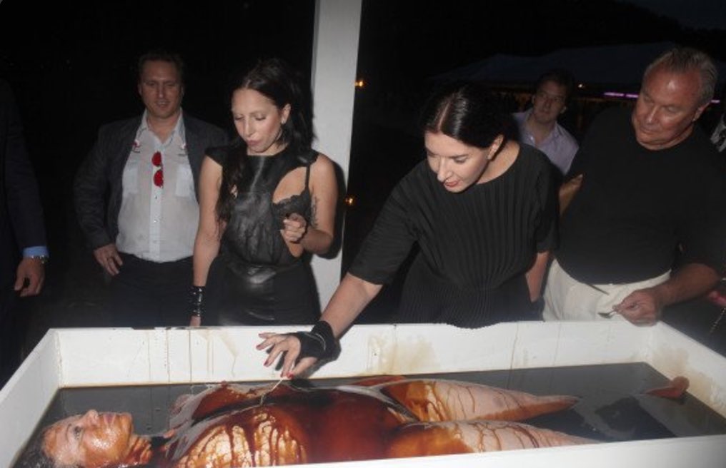 #MarinaAbramović is the creator of an “art” instillation called “#spiritcooking” in 1996 where she painted twisted messages with pigs blood. She has ties with all the elites and hosts parties with cannibalistic themes.. pic.twitter.com/TMYRU8gW2X