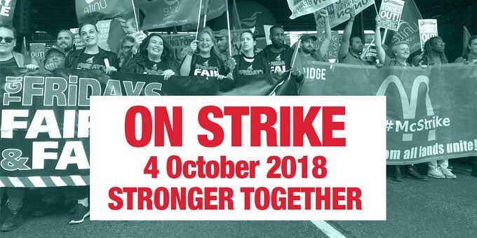 Solidarity with Workers at McDonalds,Wetherspoons, TGI Friday, Uber Eats&Deliveroo are striking today. These are workers who are seeking £10 an hour pay, more stable contracts&and for TU recognition by the companies.