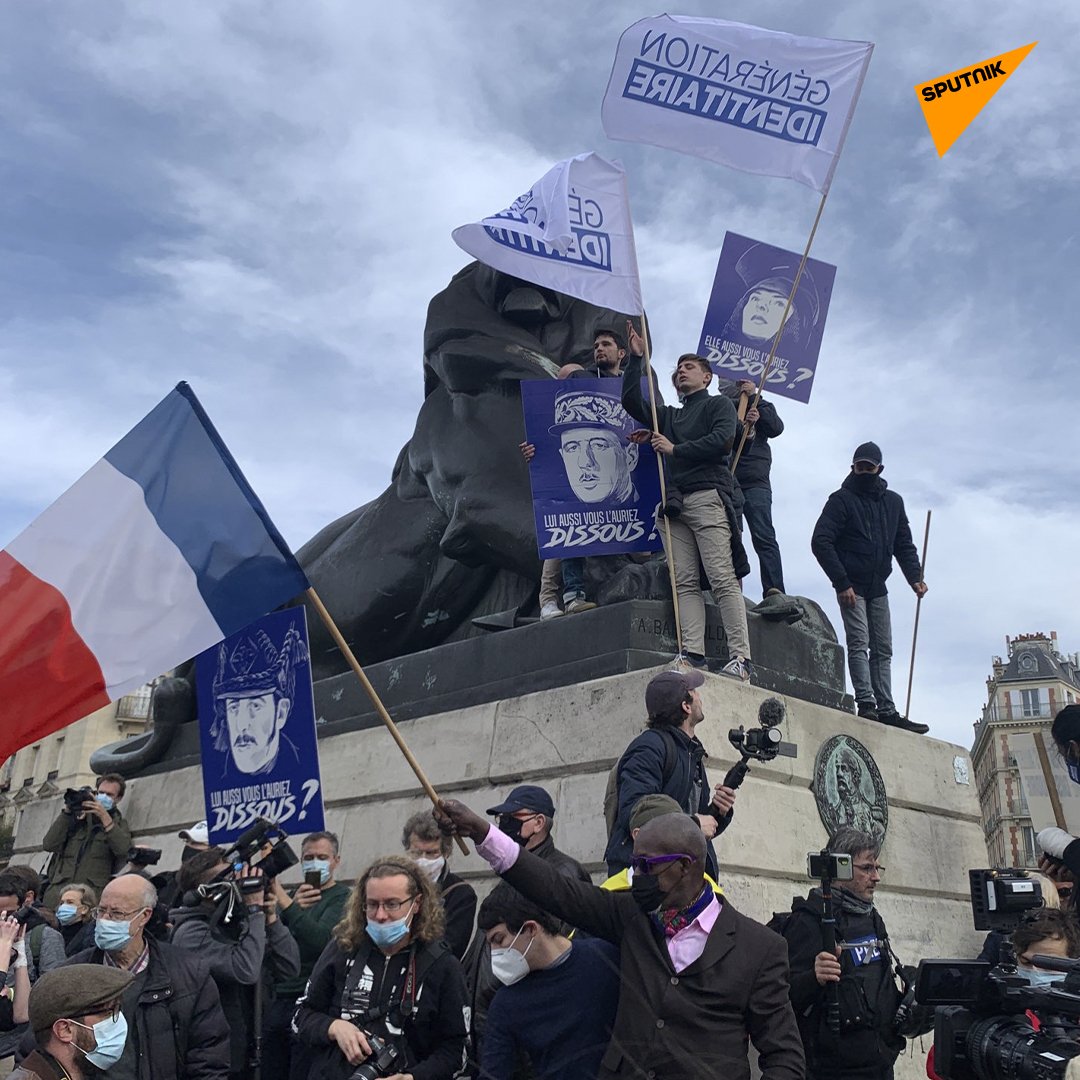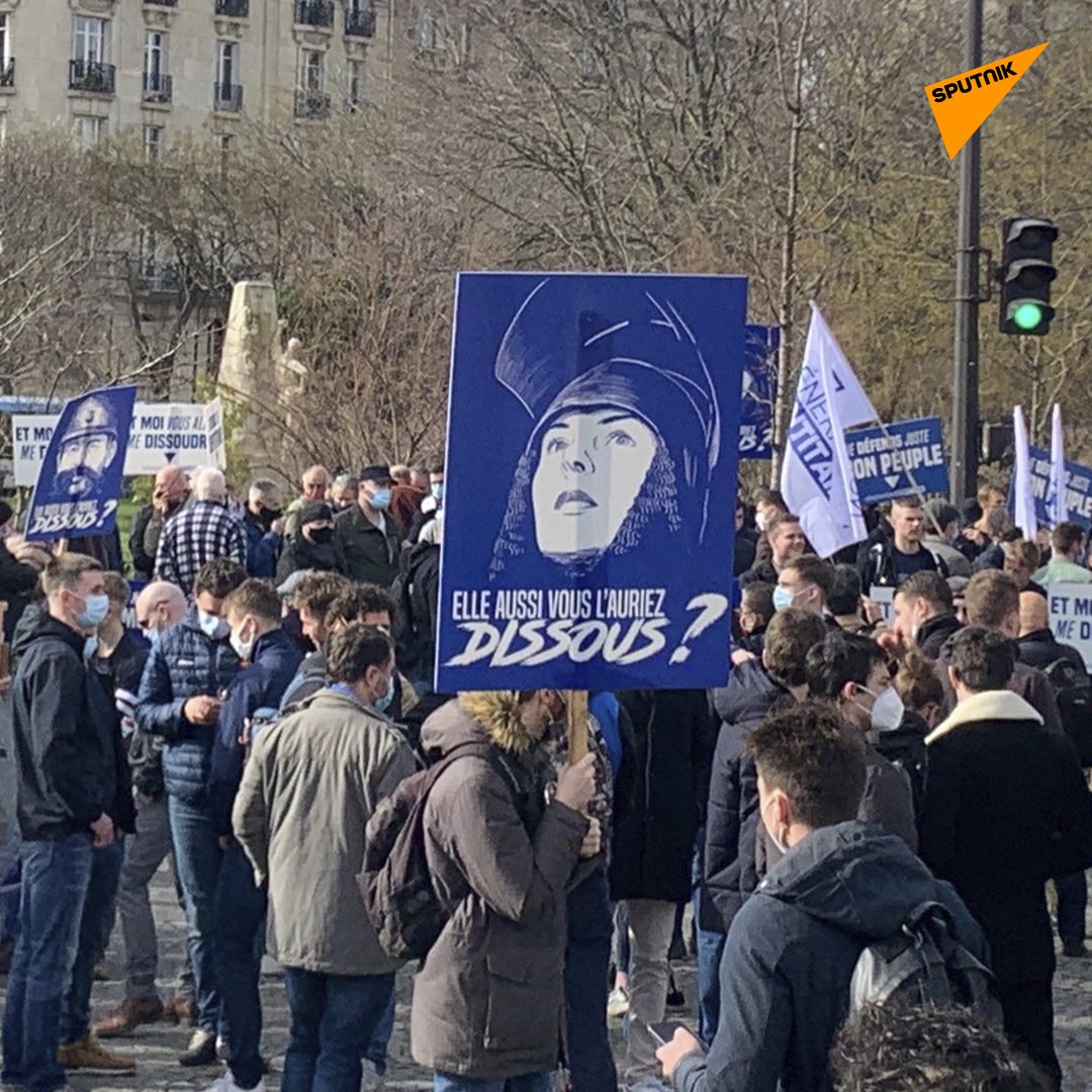 @sputnik_fr: "#SputnikPhotos | «Elle aussi vous l’auriez dissous?»: des manifestants protestent contre la dissolution de#GénérationIdentitaire, arborant des pancartes avec des portraits de Jeanne d’Arc et de soldats"