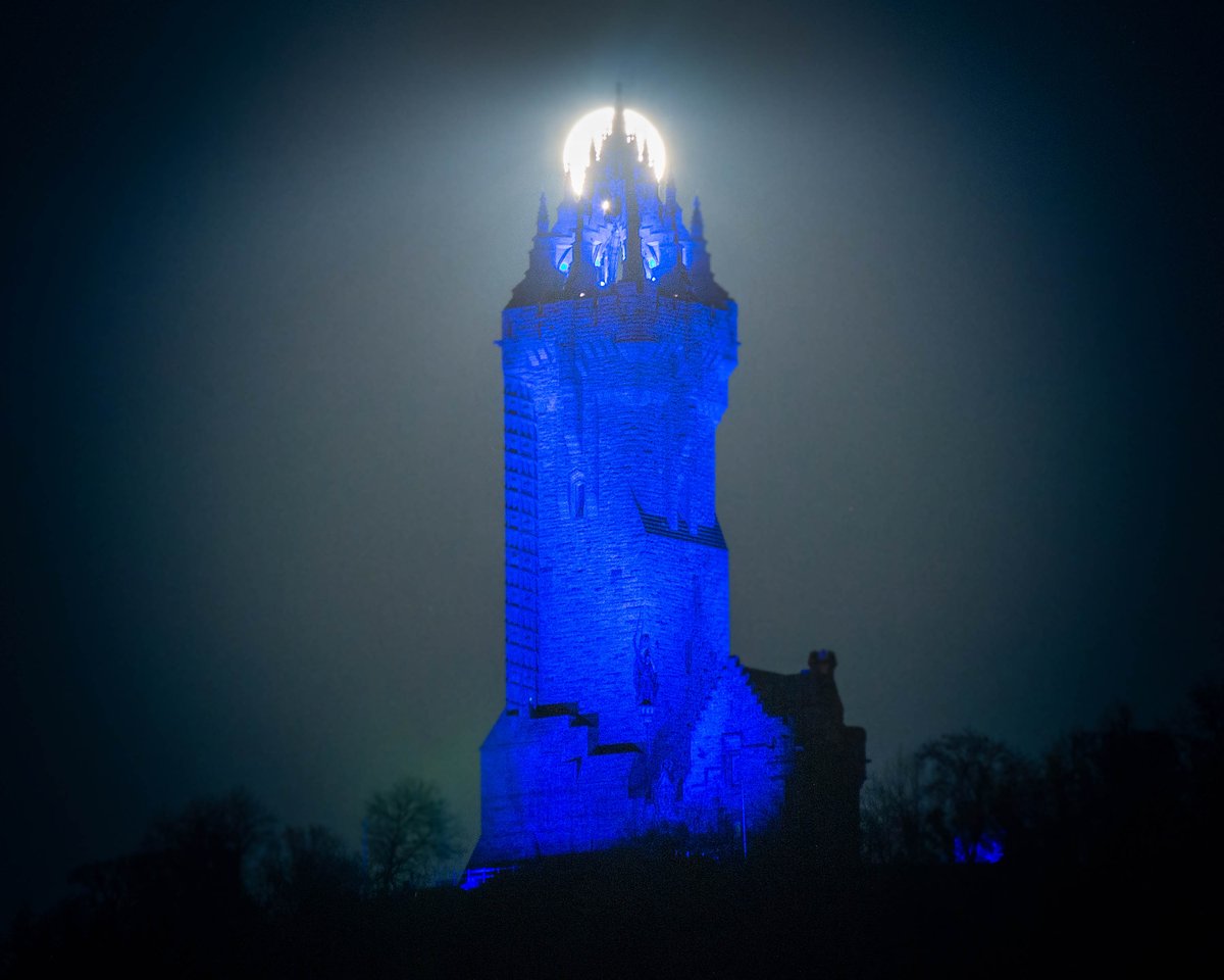 A stunning sight tonight as the National Wallace Monument turns blue for #StAndrewsDay to the backdrop of a full moon. Today, we confirmed that we will grant free entry to the Monument to every#Stirling Council resident in 2021.
