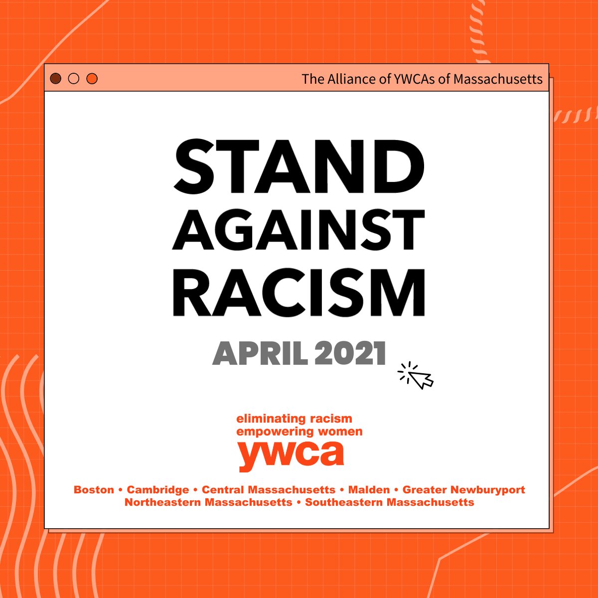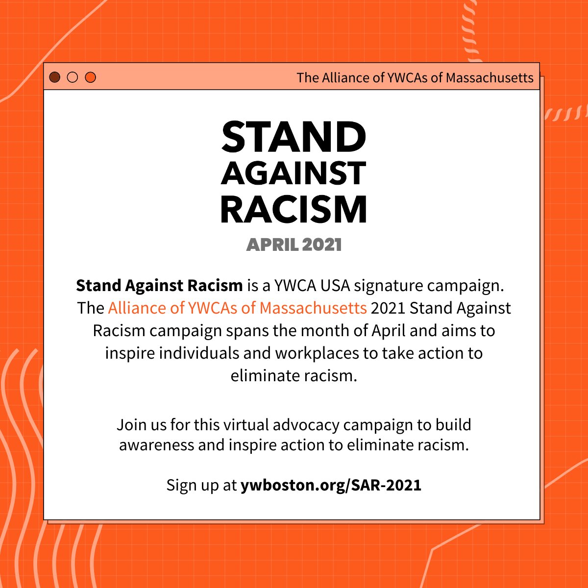 #StandAgainstRacism campaign is underway! This virtual campaign, now in partnership with the YWCAs of MA, spans the month of April and inspires individuals and workplaces to take action to eliminate racism. Find out how to participate & register: https://www.ywboston.org/our-work/our-programs/stand-against-racism/sar-2021-registration/ … -